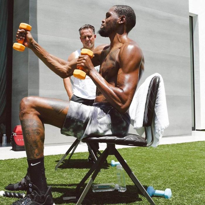 训练中他很少主动休息喝水,每次训练师让他停下来休息,他都说“不用,接下来我们练什么?”这可能也就是他在遭遇大伤之后仍处于巅峰的原因之一,这位训练师称赞杜兰特是NBA历史上最有进攻天赋和多样性的球员。本赛季33岁的他仍能交出场均29.7分7.9板5.9助攻的数据,场均37分钟出场时间!