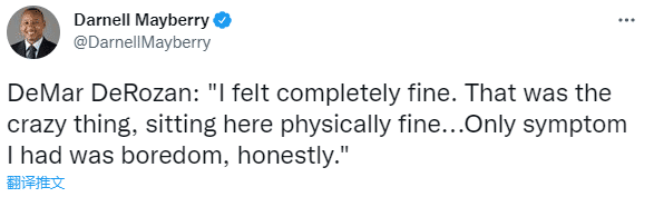 时隔12天重返球队,德罗赞谈到触发防疫协议被隔离的真实感受,他表示:我感觉很好。那是疯狂的事情,坐在这里的身体感觉很好,老实说,我唯一的症状就是无聊。