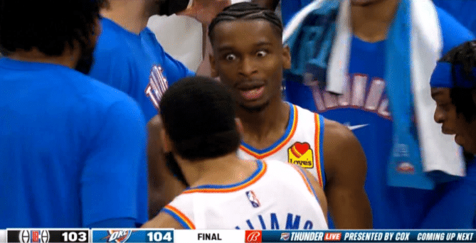 雷霆和快船末节还剩最后6.9秒,吉迪边线发球,把球传给穆斯卡拉,之后穆斯卡拉把球传给亚历山大,面对巴图姆的干扰,亚历山大一个急停晃开巴图姆的防守,稳稳命中压哨三分,手起刀落,终场哨响,雷霆主场绝杀快船,此时亚历山大疯狂跳舞庆祝,雷霆主场响起震耳欲聋的欢呼声和尖叫声,球馆全都沸腾了。