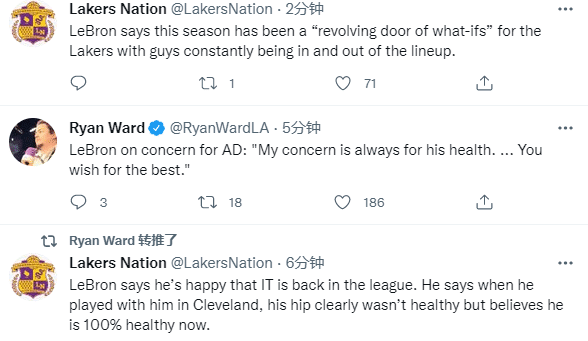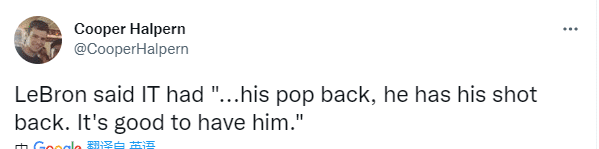 赛后谈到小托马斯的表现,詹姆斯表示他曾和小托马斯一起在骑士打过比赛,那时候他的臀部伤势还没好透,相信现在他的伤势已经100%痊愈;詹姆斯还表示小托马斯回来了,直言有他真好。