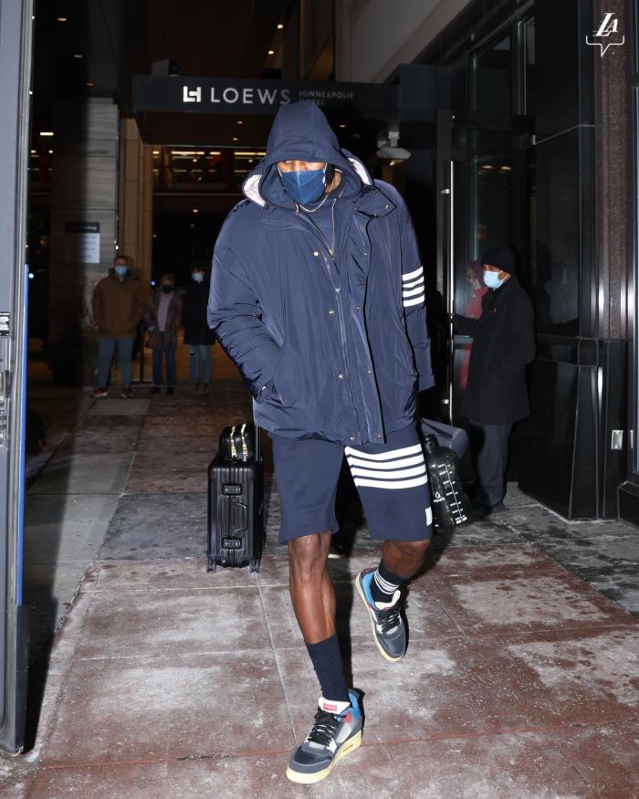 即将37岁的詹姆斯身穿加绒外套,戴着帽子和口罩,并且提着自己心爱的大水壶,却穿着“透心凉”的短裤,零下7度穿短裤,老詹真是“帅气冻人”;相比于洛杉矶,明尼苏达十分寒冷,难道老詹忘记带长裤了吗?老詹身后的很多人都是长裤+厚外套。