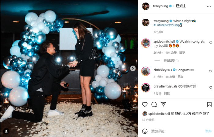 特雷-杨亲自宣布成功求婚,米切尔第一时间点赞并且恭喜好兄弟。
