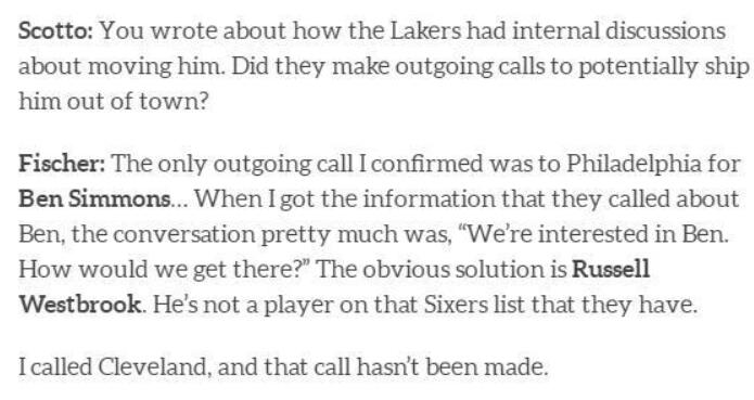 而这则消息表明的一个更深层次的迹象,就是湖人已经开始要兜售威少了。因为还有记者爆料,湖人除了和费城进行讨论之外,和骑士也展开对话,希望可以得到乐福,不过没有得到回应。为了詹姆斯生涯最后的巅峰继续冲冠,湖人别无选择。