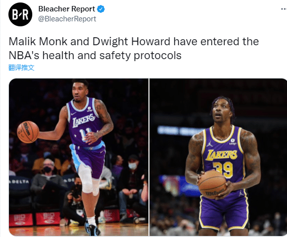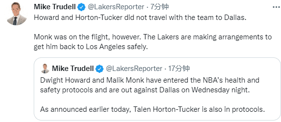 湖人队3名球员——霍顿-塔克(阳性确诊新冠)、霍华德和蒙克