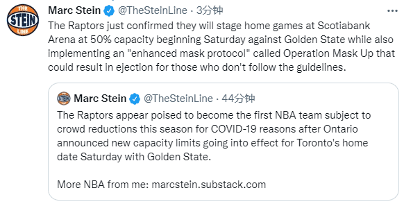 针对当地疫情泛滥的情况,多伦多猛龙已经决定限制球迷入场,只允许50%的球迷进入球馆,而且要求佩戴口罩,若有球迷违规,他很可能被赶出球馆。