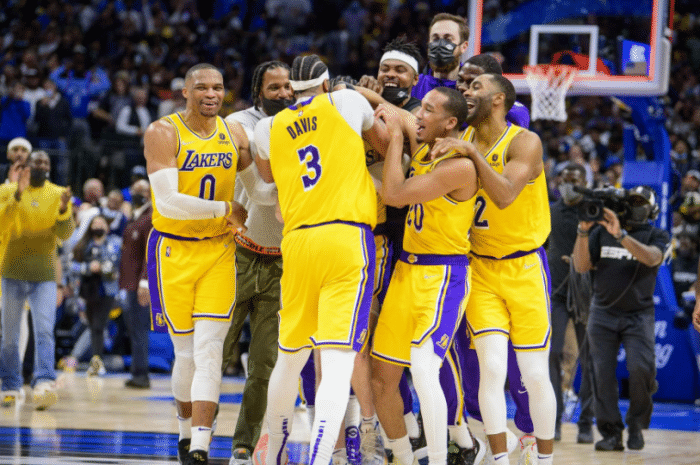 湖人绝杀后,詹姆斯、威少和浓眉三巨头都满脸笑容,紧紧搂着里夫斯疯狂庆祝;湖人又是加时赢球,本赛季已经有6场比赛打进加时赛,战绩是5胜1负,每一场都赢得很刺激;回到更衣室,湖人全队再次为赢球大功臣而庆祝。