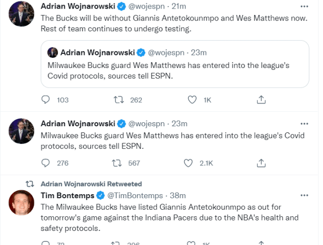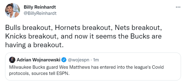 雄鹿方面的消息,字母哥和马修斯都触发协议,目前已经被隔离,雄鹿的其他球员还在接受检测。NBA记者Billy谈到疫情时感慨道:“公牛爆发了,黄蜂爆发了,篮网爆发了,尼克斯爆发了,现在看上去雄鹿也快爆发了。”