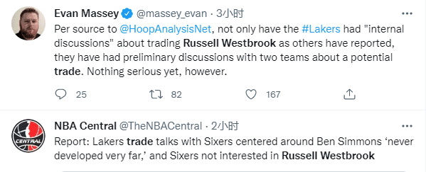 根据最新报道,Evan Massey报道,湖人不仅仅是在内部讨论交易威少,他们已经和两支球队就关于威少的潜在交易进行了初步谈判,目前没有什么重大的实质性进展。