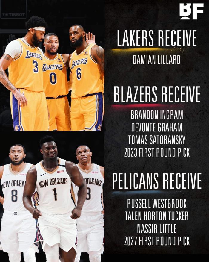 湖人把威少和霍顿-塔克送到鹈鹕,得到利拉德;开拓者把利拉德送到湖人,得到英格拉姆、格拉汉姆、萨托兰斯基和2023年首轮选秀权;鹈鹕得到威少、霍顿-塔克、利特尔和2027年首轮选秀权。