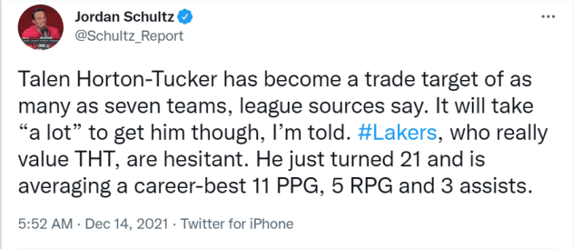 来源:24直播网12-14 16:0324直播网12月14日讯 ,据NBA名记Jordan Schultz报道,联盟消息源透露,湖人21岁球员霍顿-塔克已经成为多达7支球队的交易目标。报道称,要得到霍顿-塔克,需要付出不少筹码。湖人非常重视塔克,仍在犹豫。刚刚21岁的塔克场均11.3分4.5篮板2.9助攻,三项数据都创生涯新高。