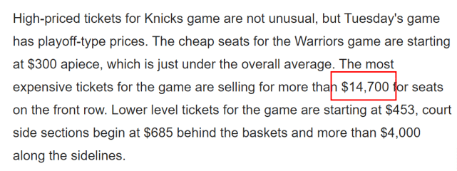 尼克斯主场球票的价格一向是联盟最贵之一,但这场常规赛的票价已经卖到了季后赛的级别。据悉,这场比赛的最低票价是300美元,而尼克斯主场球票虽贵,常规赛最低票价也基本都在200美元以下。