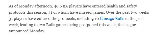 截止到目前,本赛季全联盟已经有46名球员触发防疫协议,其中41人缺席了比赛,在过去的两周,总共有31名球员进入防疫协议,过去一周公牛队有10名球员中招,目前队内仅有8人能参加比赛,这导致公牛推迟了与活塞和雷霆的比赛,NBA官方已经批准公牛的请求。