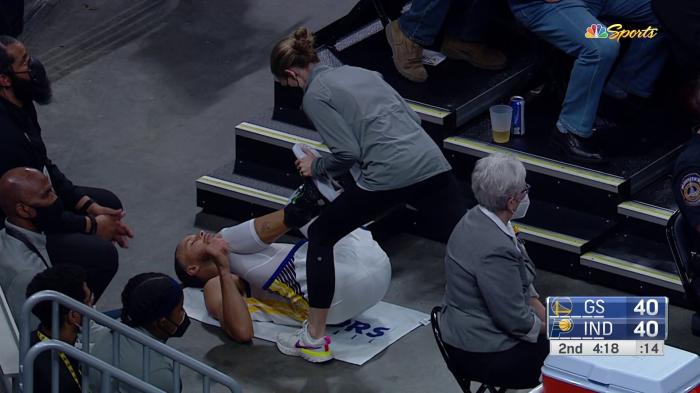 库里接受治疗一幕曝光,疑似受伤!躺在地上让队医为他拉伸大腿