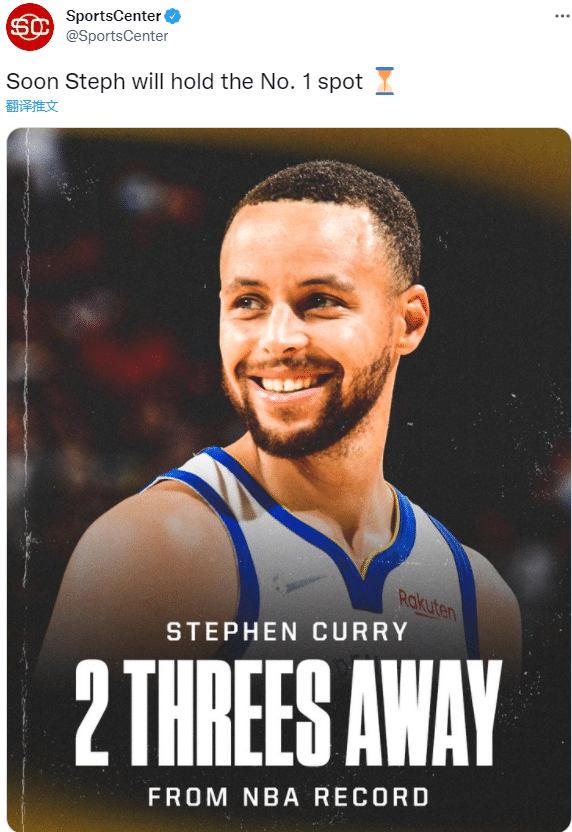 美媒SportsCenter晒照并且配文写道:库里很快就会成为历史三分王。
