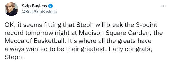 名嘴斯基普-贝勒斯发推:好吧,明天晚上斯蒂芬将在篮球圣地麦迪逊花园广场打破3分记录,这很合适;所有的伟人都想在这儿成为最伟大的人。提前祝贺你,斯蒂芬。
