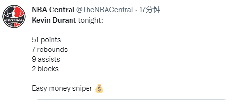 杜兰特尽情挥舞死神镰刀——第一节10分小试牛刀,第二节6分多钟轰下12分,第三节8中7独砍16分,末节13分带队早早锁定胜局,由于比赛悬念已经没有了,比赛还剩1分05秒,杜兰特提前下场,身背五犯仍狂砍50+太疯狂。