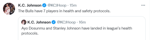 库兹马的消息出来后,名记马克-斯坦恩表示联盟现有16人处于健康安全协议下,但随着多森姆和约翰逊、托平的加入,人数增至19人。其中,公牛7人,黄蜂5人,非球员被隔离的包括步行者的卡莱尔和猛龙总经理乌杰里。