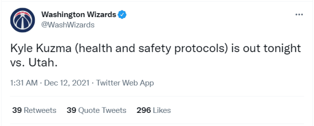 奇才官方宣布库兹马触发健康安全协议,对于近况不错的库兹马来说,这确实是一大打击。加盟奇才以来,库兹马场均13.4分8.3篮板2.9助攻,击败活塞一战,库兹马还命中了一记准绝杀三分。现在他不得不缺席多场比赛。