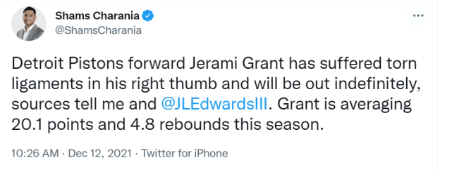 格兰特的伤停,对于活塞而言是雪上加霜。目前他们的战绩排名东部倒数第一,随着格兰特的长时间休战,活塞预计会把更多的时间留给年轻人,他们本赛季已经没有希望冲击季后赛。