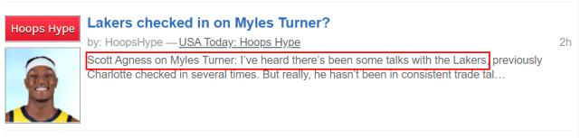 谈到特纳的交易进展,Scott Agness说:“我听说湖人和有过一些谈判,之前夏洛特(黄蜂)也谈过几次,但实际上并没有持续性的谈话,他(特纳)的名字一直被外面的人提及。”因为是来自跟队记者的消息,所以说可靠性还是挺高的,证明湖人准备做出阵容调整了,很可能要开始出手交易!