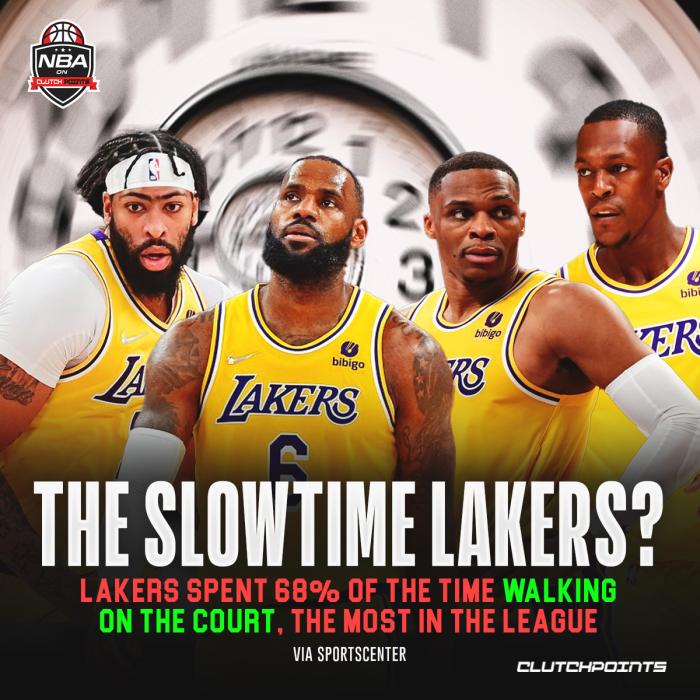 据ESPN统计,赛季至今湖人队的平均速度是联盟最慢(每小时4.25英里);比赛时在场上走路时间占全部比赛时间的比例为68%,联盟最高,场均跑动距离(9.3英里)是联盟第二少。