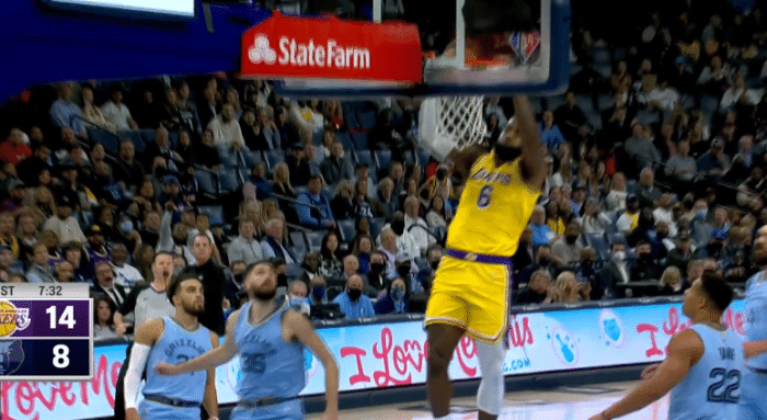 比赛正式开打,布拉德利为湖人率先得分,之后詹姆斯持球强突小杰克逊,碾压突破打成2+1;布拉德利轰进三分后,詹姆斯接威少传球上演霸气扣篮,老詹长传助攻浓眉扣篮,湖人连续三次扣篮打停灰熊,14-8占上风;前4分钟,詹姆斯不仅贡献5分,而且送出2次盖帽,防守端还造进攻犯规。