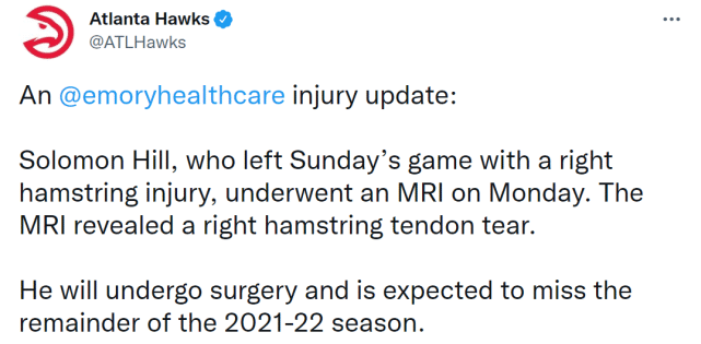 所罗门-希尔在对黄蜂一战中受伤。医学专家Evan Jeffries提到希尔的伤情时写道:“所罗门-希尔遭遇了一次罕见的腿筋肌腱三级撕裂,这需要手术治疗,腿筋肌腱从坐骨结节处撕裂,康复期可能是6-9个月。”