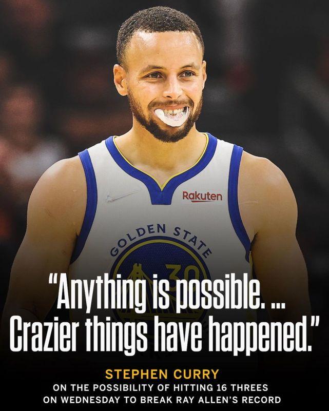 主场作战的库里,能否在今天的比赛中创造两大神迹?打破阿伦生涯三分纪录的同时,也打破汤普森的单场三分纪录?一天前,ESPN就把这个话题抛给库里本人,当库里的回应是“一切皆有可能……更疯狂的事情都发生过。”