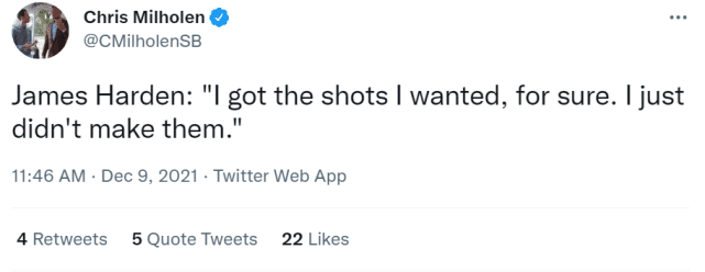 是的,全场失误8次,却只进了4个球,哈登的低迷有目共睹。赛后,哈登接受采访时感慨道:“我得到了自己想要的出手机会,但就是投不中。” 他还谈到此前在火箭效力的感受时:“非常特别。无论场上还是场下,我都在这里度过了生涯中最惊艳的时光。”