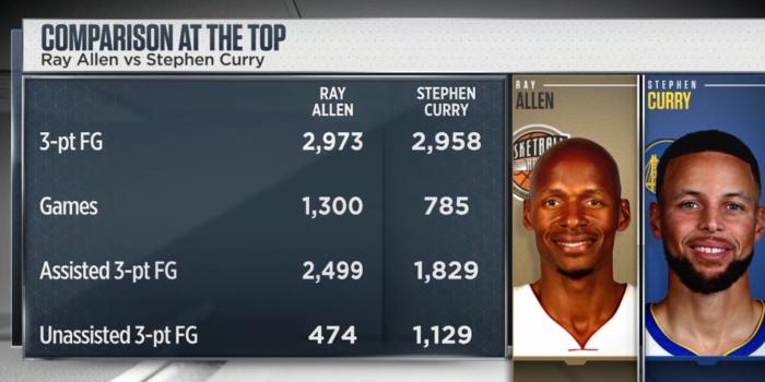勇士和开拓者上半场,库里上场15分钟疯狂出手12次三分(生涯半场出手三分第二高),命中4记三分,每当库里投进一记三分,转播方都会列出库里离雷阿伦的纪录又近了一步;下半场,库里又出手5次三分并且命中2球,单场6记三分继续迫近历史三分第一纪录。