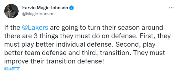 湖人有意引援兰姆,但并不意味着兰姆适合湖人体系,目前来看,湖人需要更好的防守悍将;不久前,湖人名宿魔术师点出湖人本赛季的最大问题,发推直言:如果湖人要扭转他们的赛季,他们必须在防守上做 3 件事——首先,他们必须打出更好的个人防守;第二,发挥更好的团队防守,第三,转换,他们必须提高他们的转换防守。