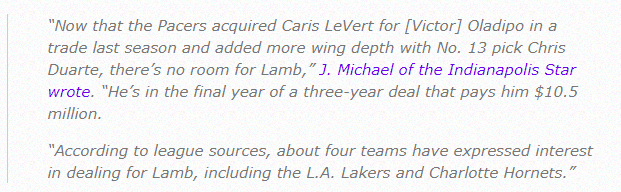据印第安纳记者J Michael报道,由于队内有勒维尔和杜阿尔特,兰姆的位置已经没有了,现在大约有四支球队有兴趣交易得到兰姆,包括洛杉矶湖人和夏洛特黄蜂。