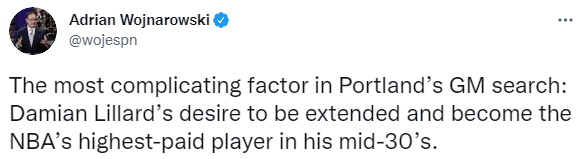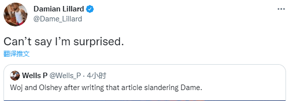 对于这样的报道,wells P发推写道当利拉德看到沃纳罗斯基的诽谤时,利拉德回应:很难不说我大吃一惊。
