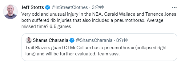 医学专家Jeff Stotts发推写道:在NBA中非常奇怪和不寻常的伤病。杰拉德-华莱士和泰伦斯-琼斯都曾肋骨受伤,其中包括气胸,平均缺席6.5场比赛。