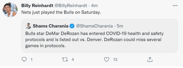 德罗赞真惨!刚成周最佳就被隔离 篮网记者担忧:和公牛才交过手