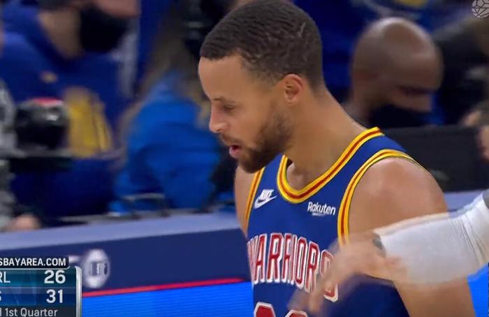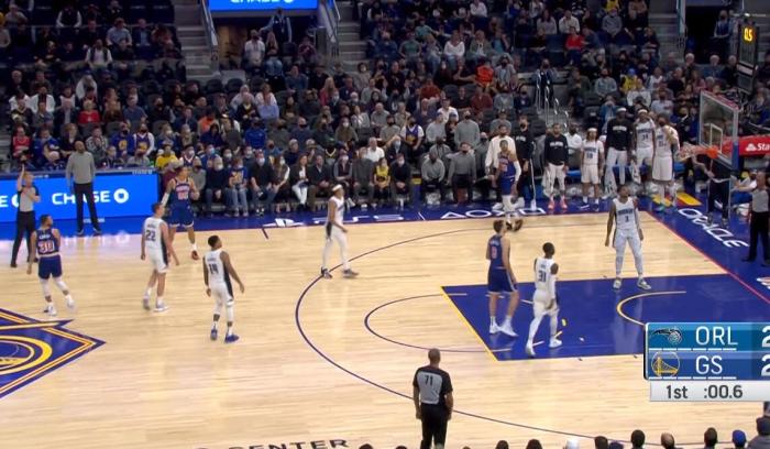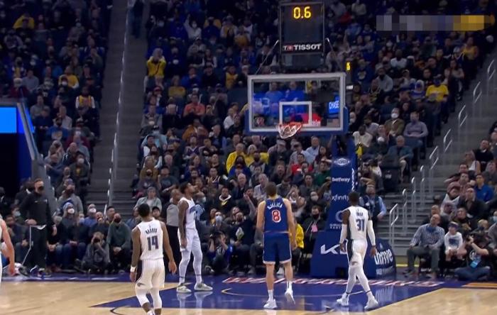上半场比赛最惊艳的一幕,无疑是首节最后时刻库里中圈命中的骑马射箭三分球。这一球,库里从后场运球,在时间已经所剩无几的情况下,在中圈线过一小步的地方,便单脚起跳,直接出手三分。皮球划过篮筐上方,随后打板命中!