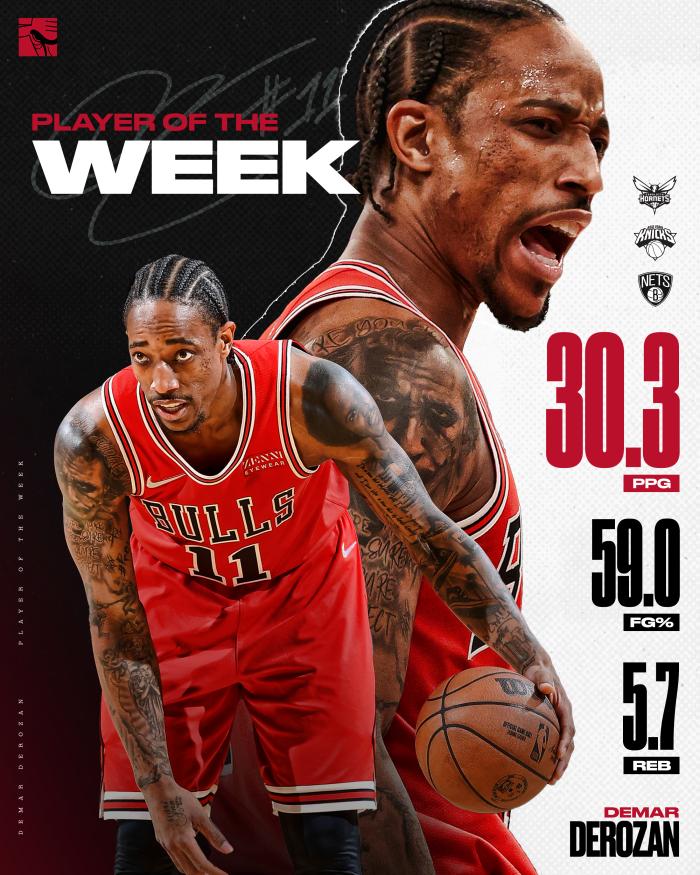 德罗赞本赛季首次当选东部周最佳,也是公牛生涯首次当选,生涯第12次获得周最佳;赛季至今,德罗赞场均拿到26.4分5.3篮板4.1助攻,带领公牛拿到16胜8负排在东部第二。