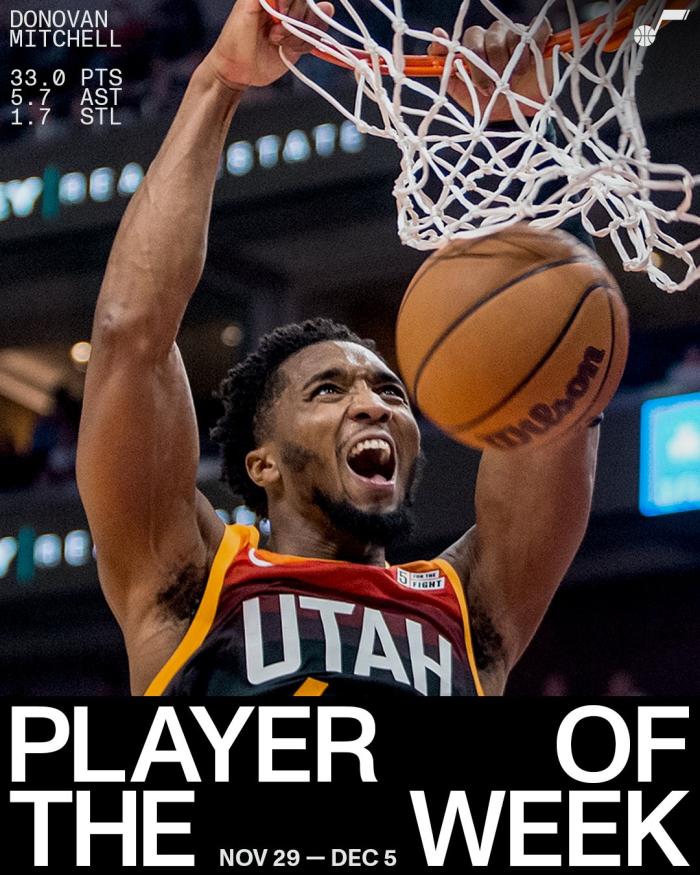 米切尔本赛季首次获得西部周最佳,生涯第3次获得此奖项;爵士官方第一时间恭喜米切尔。