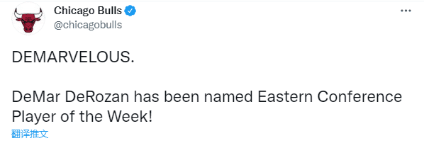 公牛官方第一时间恭喜德罗赞获得东部周最佳