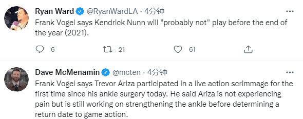 对于湖人队的伤员,沃格尔表示阿里扎本周第一次参加了实战训练,看来他还有很长的路要走,才能找回比赛状态,湖人会等到他完全恢复后再让他上场比赛,阿里扎的脚踝并没有感到疼痛,但在复出之前的这段时间里,他的脚踝力量仍需要更多恢复,他正在取得一些进步。