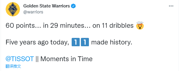 美媒Ballislifeye也晒出昔日集锦,发推:5年前的今天,克莱-汤普森狂砍60分,在29分钟内,仅仅运球11次,他持球时间只有90秒。