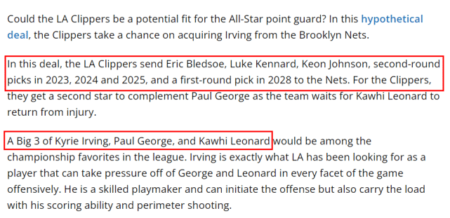 美媒认为欧文是快船一直在寻找的球星,他可以在各方面减轻乔治和小卡的压力。欧文是一个非常出色的组织者,自己的突破和三分能力也很强。