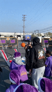 37岁安东尼身穿灰色运动裤、黑色连帽卫衣和黑色拖鞋,戴着印有湖人logo的口罩参加活动,休闲连帽瓜又上线了;瓜哥坐在椅子上比V合影,还和小朋友比投篮,随手一扔故意输给小球迷。