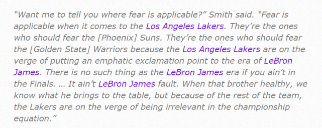 “想要我告诉你恐惧在哪里适用吗?”A-史密斯说道,“当我们谈到洛杉矶湖人时,恐惧是适用的。他们是那支应该对太阳心存恐惧的球队,他们是那支应该对勇士心存恐惧的球队,因为他们即将为詹姆斯时代标注一个强烈的感叹号。如果你打不进总决赛,就没有詹姆斯时代这样的东西了……这不怪詹姆斯。当这个兄弟健康时,我们都知道他会带来什么,但考虑到这支球队余下球员的配置,湖人即将在总冠军方程式里变得无关紧要。”