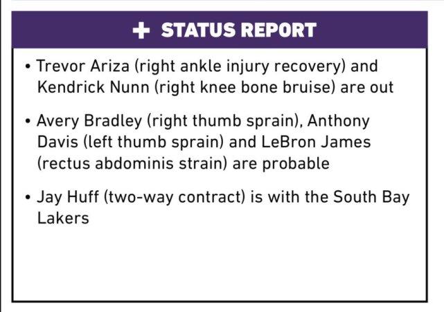 根据湖人官方公布的最新伤病名单,此前对快船一战被列为questionable(出战成疑,上场可能50%)的詹姆斯和布拉德利,状态已经升级为probable(大概率出战,上场可能75%),同为这一状态的还有左拇指扭伤的浓眉。