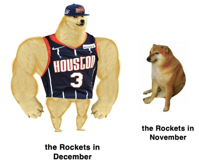 比赛结束之后,火箭在社交媒体上发布一张趣图对比,12月的火箭和11月的火箭,11月份火箭如同哭泣的小狗,而12月份的火箭豪取连胜,身强力壮,确实非常生动形象。