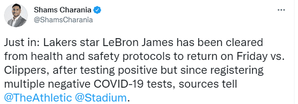 如今詹姆斯已经解除隔离,不在健康与安全协议之中,可以出战下一场与快船的比赛。