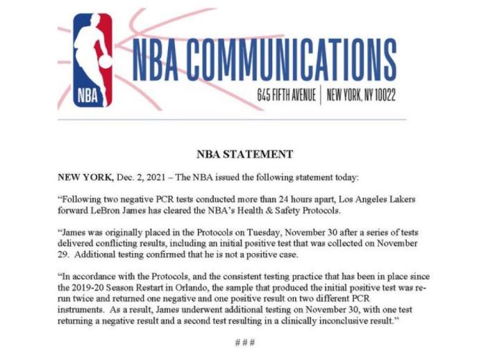 NBA发表声明:24小时内连续检测呈阴性之后,湖人前锋勒布朗-詹姆斯已经解除健康和安全协议,詹姆斯最初确诊为阳性;进一步的检测结果证实他不是阳性病例。