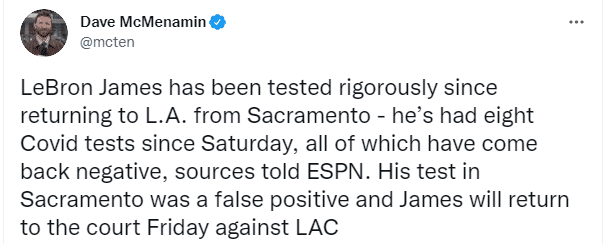 名记Dave McMenamin跟进报道,消息人士告诉 ESPN,詹姆斯从萨克拉门托回到洛杉矶后,詹姆斯接受了严格的测试——自周日以来,他已经进行了八次新冠病毒测试,所有测试结果都呈阴性。他在萨克拉门托的检测是假阳性,詹姆斯将复出对阵快船。