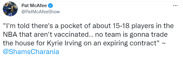 shams还表示:我听说NBA还有大约15-18名球员没有接种疫苗,没有一支球队愿意用到期合同交易欧文。